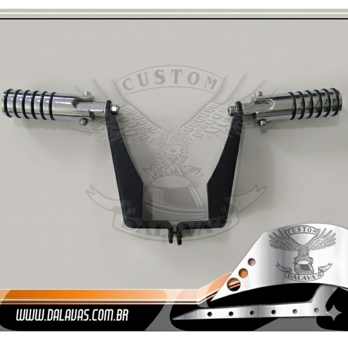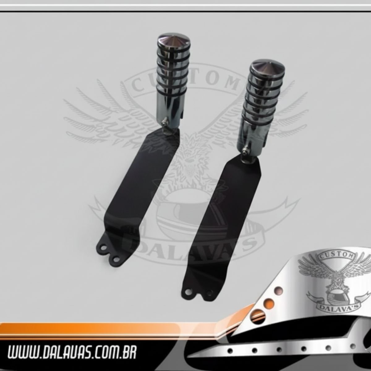Acessório confeccionado em aço com acabamento preto texturizado no corpo e cromado nos pedais.